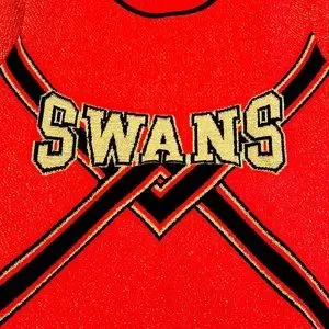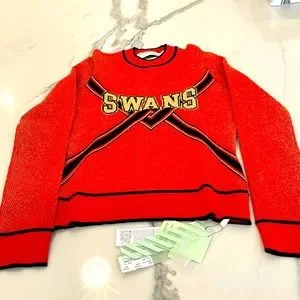 Ribbed edges 'Swans' front intarsia 76% Viscose, 10% Polyester, 14% Polyamide. Color: orange