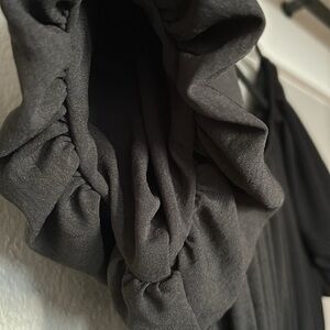 NWT dress that is beautifully draped. Ballon sleeves. Very bottom of dress has a slight fray/unraveled spot. See the Picture! Not noticeablee when wearing. Slightly above the ankle/ shin length. Could be worn on or off the shoulder. Hits at shin on a 5’3” person.