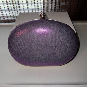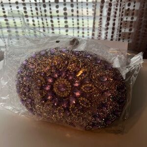 Gorgeous! NWOT, packaging intact RAMLA purple gemstone handbag/clutch with gold colored handle and chain. Iridescent purple coloring on side closest to clothing with a beautiful, handmade jewel design on the exterior. Satin lining, snap jewel enclosure at the top.