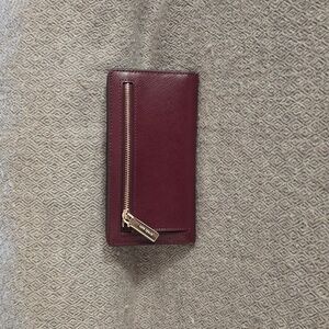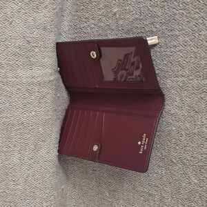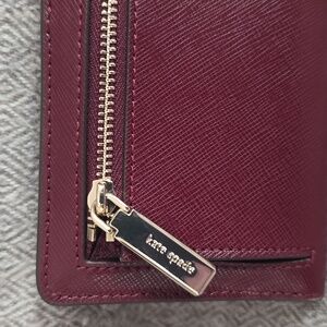 Gently used kate spade maroon wallet. Zipper pocket on backside, snap front, ard holders, photo id, pockets on both sides. Great wallet. 7"x4".
