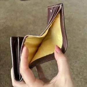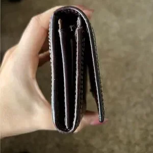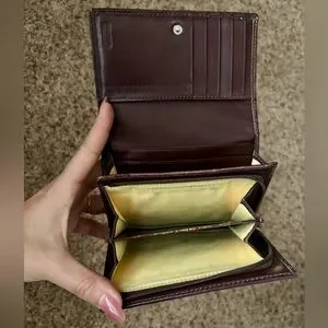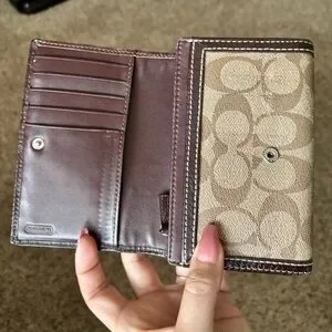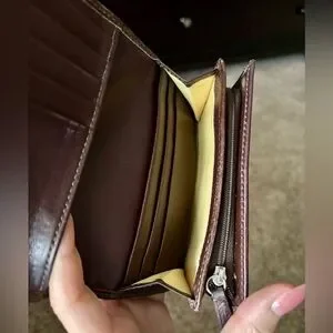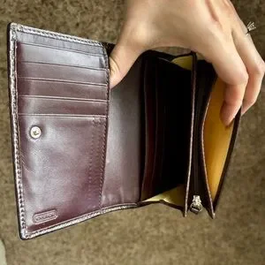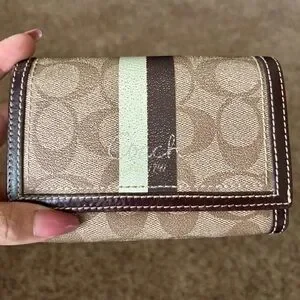 Coach Heritage Stripe Wallet accented with tan Signature coated canvas. Back has an open pocket with a yellow colored sateen interior that is in good condition. There are 5 card slots, 4 open pockets, zippered accordion coin pocket and large bill pocket. The wallet has been preloved with signs of use as pictured. There is yellow colored fabric in the pockets.