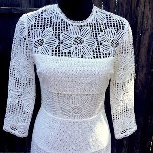 Gorgeous, quality workmanship, and details throughout this Trina Turk designer dress with 3/4 length sleeves, long keyhole opening in back and round, crochet lace edged neckline that hooks in back of neck. Exudes class and a fun, light heart! Floral Guipure lace and embroidered eyelets throughout, lined except sheer above bust and below knees. Invisible zipper in back. From Anthropologie / BHLDN. Perfect for a party, cocktail or special event.