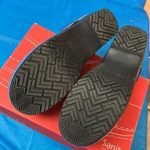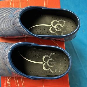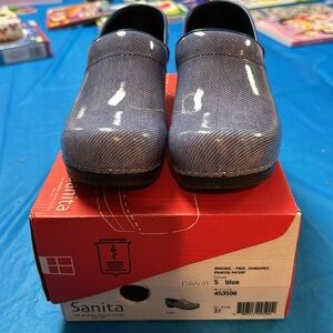 Sanita clogs, “Dungaree” printed blue patent. The original Danish clog. European size 37, like size 6.5-7. Excellent condition.