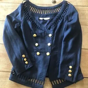 The blazer is double breasted with gold buttons. Squares cut details on hem and around the collar.