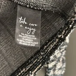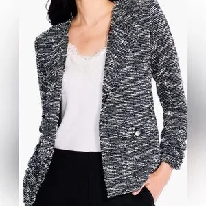 Light up the night, and anytime, with this super stretchy, super stylish layer. Tiny threads of metallic threads in the weave of this fashion jacket add some night sky shine and sophistication. Starry Sky is unlined and features textured scrunch sleeves, an easy a hook and eye closure, patch pockets, and a hem that sits at the hip. Perfect for layering!