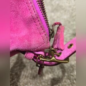 Vintage Coach.. She was made in the early to mid 2000s. Bag does show signs of wear. In the photos, you can see that there are spots that will need to be cleaned with suede cleaner. They should buff out, mostly the corners, if done correctly. The price reflects that. It will totally be worth your time. I love her, but she is just not my style anymore, and my daughter hates pink. Go figure, right? She needs a new life.. please give it to her (the bag). She has her original tag and tassle. The strap can be switched to wear on either side. Really beautiful berry wine color monogrammed fabric on the inside. My gigantic Samsung Ultra can fit inside of her no issues. Open to offers.