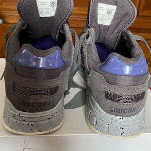 Saucony men’s Shadow 5000 Black/Crystal, 8.5. Grey with purple. Soles are grey with black spots. Preowned and gently worn. Very good condition. Plenty of life left in these sneakers. Origin box, slightly ripped.
