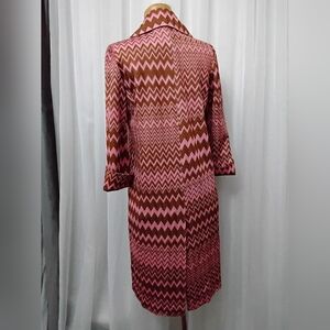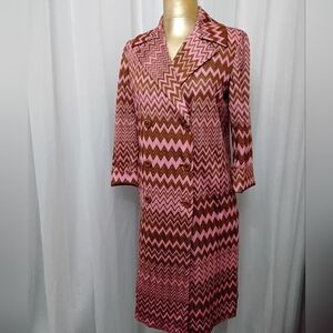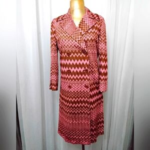 A stunning vintage Missoni coat from the late 1960s to early 1970s, showcasing the brand's signature zigzag knit pattern in beautiful pink and earthy brown tones. This rare double-breasted coat reflects Missoni’s iconic craftsmanship and timeless Italian style. A perfect addition for collectors or lovers of luxury vintage fashion.
