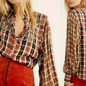 Free People EUC, gorgeous embroidered blouse. An elevated take on the everyday flannel. Embroidery and a slight puff sleeve.button up details and cuffs. Soft flowy and versatile