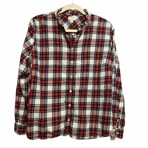 J.CREW Womens Festive Holiday Plaid Flannel Button Up Shirt Ruffle Neck Trim