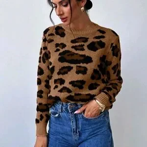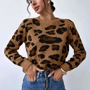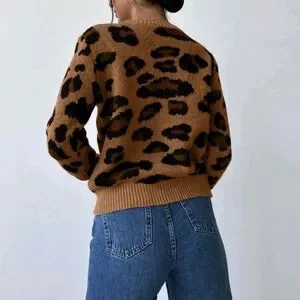 Women Vintage Chic Leopard Print Oversized Loose Knit Sweater, Warm & Stylish