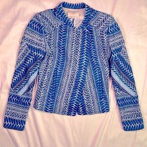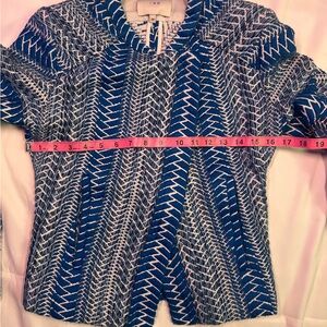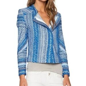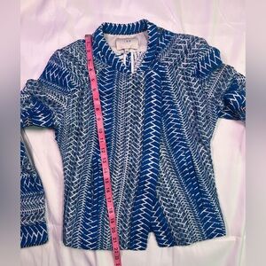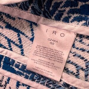 Blue and white Iro Ozaka jacket with lightly padded shoulders, two pockets and asymmetrical zip closure at front.