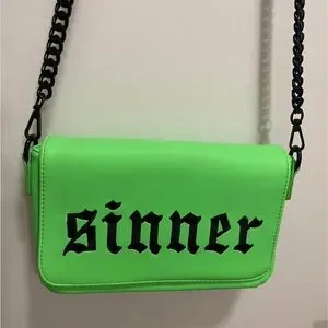 Blackcraft “Sinner" embroidered text on faux leather crossbody with matte black finish hardware and premium quality chain. Removable crossbody strap allows to be carried as a clutch. Custom interior