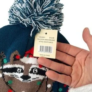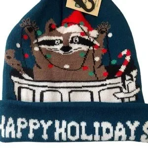 NWT Navy blue winter beanie featuring a cute raccoon with Christmas lights