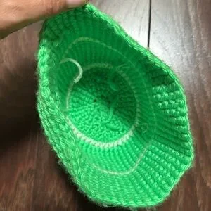 Cute hand knit hat. Green and white with black button eyes and ears. Never worn. Size similar to 12M