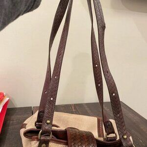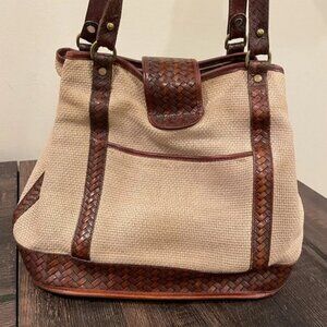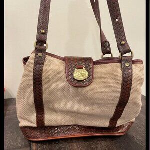 Vintage Brahmin Harbor khaki woven shoulder bag with brown leather trim handles