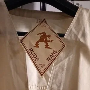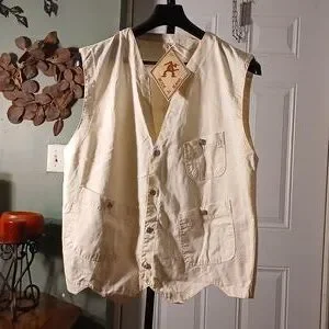 Rude Men's vintage Button down Four pockets. Color off-white vest Size 2XL. Has design in the back. 100% cotton, 27in Armpit to bit 24in across the chest. 22in shoulder to shoulder.30in length.