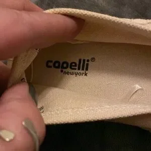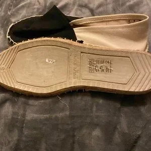 Black & cream with cream stitching all around. Straw platforms & hard solid sole.