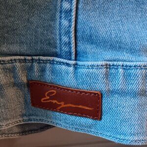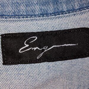 Emg buttoned denim jacket. Two front pockets. Stripped detail running throughout the back and sleeves. 93% cotton, 6% elasterell-polyester, 1% Lycra. Like new. Smoke free and no pet household.