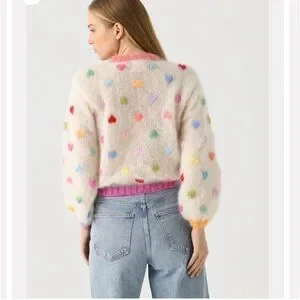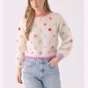 A cozy knit sweater featuring contrast trims and an all-over multi-colored heart pattern.