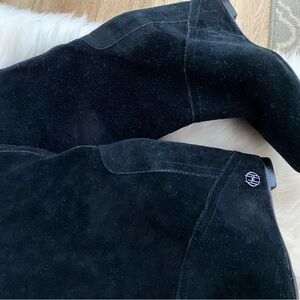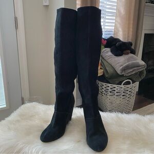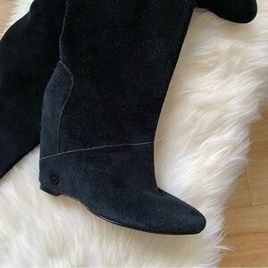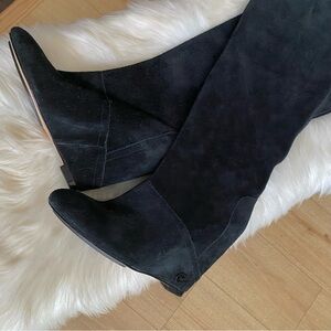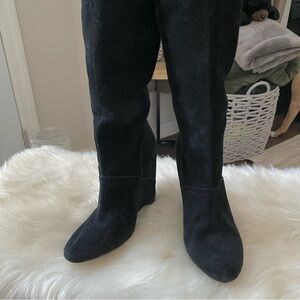 House of Harlow Black Suede Wedge Knee High Boots in good condition. Logo on bottom. Some fuzzies appearing (common with suede), but you cannot tell without close examination. The wedge and lining makes these boots very comfy to wear. Size 38.5