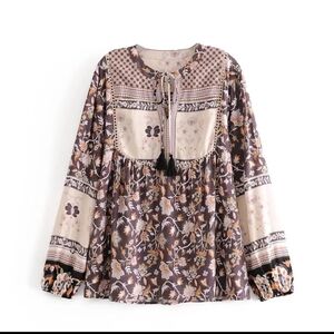 Bohemian style top with floral design patterns.