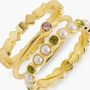 Glossy pearls and sparkling stones give definition to a trio of slim and stackable rings.