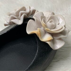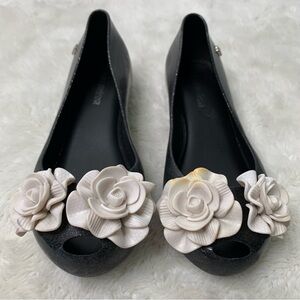 Mini Melissa Girl's Black Ultragirl Garden Floral Slip On Flat Shoes Size 8-9