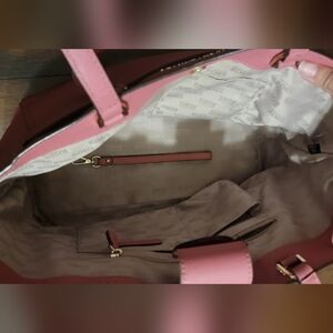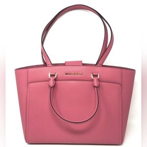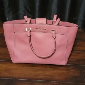 Michael Kors Emmy Large Double Handle Tote Handbag Tulip Saffiano Leather. Small area with trim missing on the handle, as shown in the last picture, otherwise in great condition. Retails for $428.