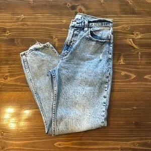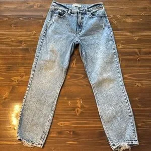 NWOT Abercrombie & Fitch high rise mom jeans size 27 (4). Bleach light washed color, never worn in great condition. Jeans feature smalls feature distressed ankles and distressing on the pockets.