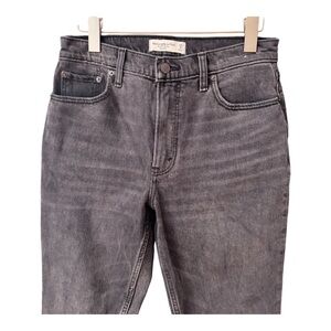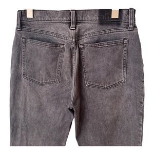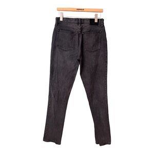 About Item: Zipper to button closure, belt loops, 5 pocket design. High rise, skinny leg, minor distressing seen at hems. Very little stretch, color is a faded black/gray