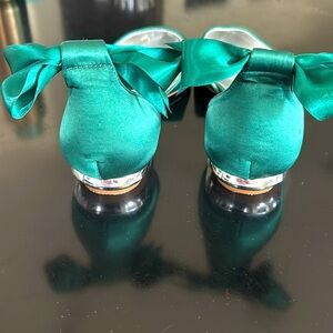 Emerald Green satin pointy toe flats with bows NWOB Silver accent heel size 40