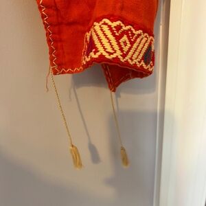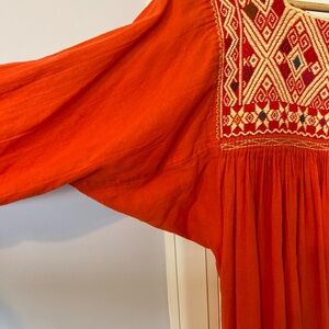 Cleaning out my closet. This is a cotton dress in Red Orange color way with embroidery. I purchased as a vintage dress on Etsy and there are no labels, but at time of purchase listing said it was made in the 1970's. It's in great condition. Would best fit a small, but it is a loose fit so could fit up to a medium. Fabric is thin, I wore a slip under it. Tassles on sleeve opening. Great condition, no noticeable flaws. Beautiful embroidery, and light, soft fabric perfect for summer.