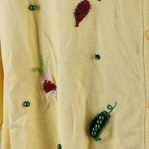 Quacker Factory V-Neck Cardigan Womens 3X Yellow Embroidered Beaded Vegetables