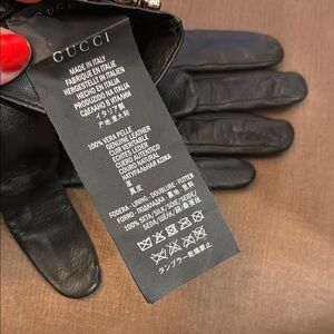 Luxurious black leather GUCCI gloves featuring stunning crystal embellishments along the wrist. These sophisticated gloves combine classic style with glamorous detail. The soft leather construction offers both warmth and style, while the sparkling crystals add a touch of elegance perfect for special occasions.