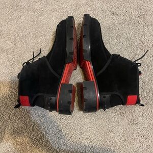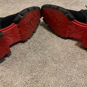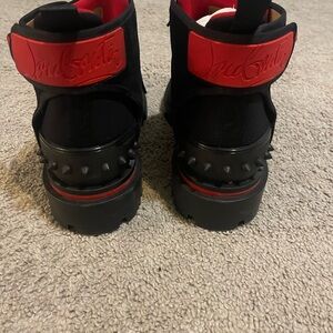 Elevate your style with these Christian Louboutin men’s boots. Made of premium black suede with striking red soles and red accents, these size 11 boots feature a lace-up design, chunky tread sole, and spiked heel detail. In excellent condition with minimal wear, they’re perfect for making a bold statement. Don’t miss out on this luxury footwear!