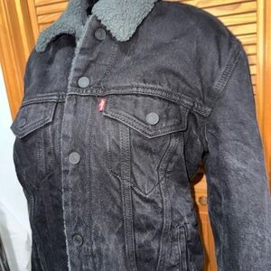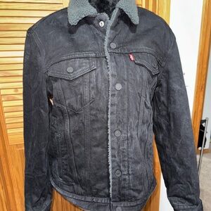 Stay warm and stylish with this black denim jacket featuring a cozy sherpa lining. Perfect for casual outings and versatile enough for any wardrobe.