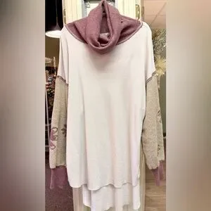This is a unique, beautiful sweater by free people and a size extra large. It is a tunic cow neck. The arm details are wonderful. The texture of the main part of the sweater is more of a thermal. Wear the sleeves and the cow neck are more sweater.