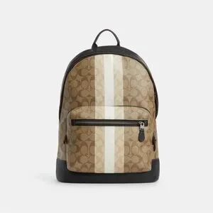 Signature coated canvas and smooth calf leather Two separate main compartments with zip closures Inside zip cell phone and multifunction pockets Fabric lining Top handle with 2 1/2 drop Outside zip pocket Adjustable shoulder straps 12 1/2 (L) x 16 3/4 (H) x 6 (W) Style No. CQ629 | Coach Outlet West Backpack In Blocked Signature Canvas With Varsity Stripe - Beige