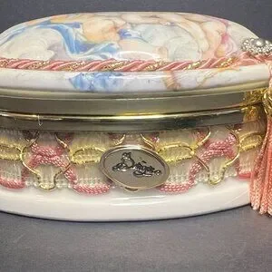 Selling a Vintage MCM Berger Porcelain Hinged Cherubs Oval Trinket Box. It measures 2.25" (h) x 4.5" (l) x 3.25" (w), it has lace detailing, gold trim, and pink tassel. Made in Italy. It's in very good condition!
