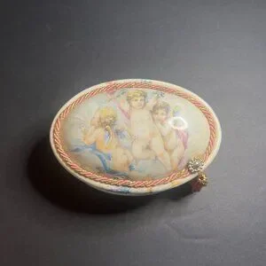 VTG MCM Berger Italian Porcelain Hinged Cherubs Angels Oval Trinket Box w Tassel