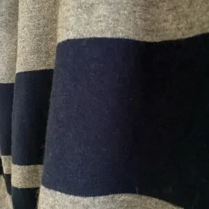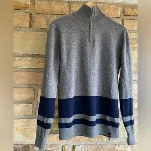 No longer being sold; Very lovely striped wool grey and navy blue sweater, Size Small. Gently used with minimal wear, barely noticeable minor piling on sides.