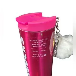 New with tags. Holiday 2023 hot pink metal tumbler vacuum sealed 16 Oz white puff Barbie girly hard to find limited edition
