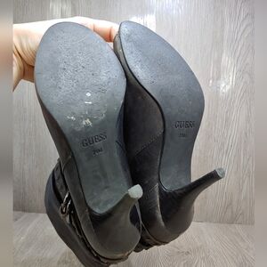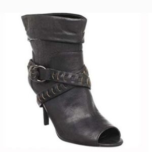 Guess Allegrate Open Toe Heel Ankle Bootie Leather Black Brown Buckle 7.5