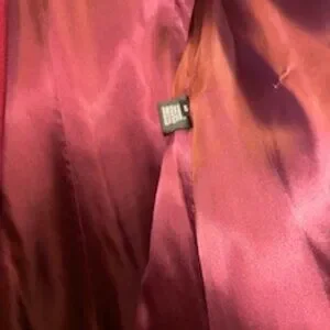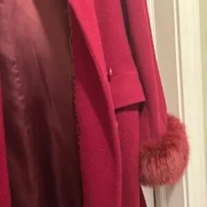 Beautiful very pretty three-quarter length Redish Burgundy lamb/wool coat with satin lining. Looks amazing when dressed up going out to special events. I've received numerous compliments on this coat. One button is missing on the coat.