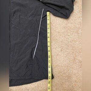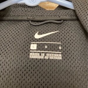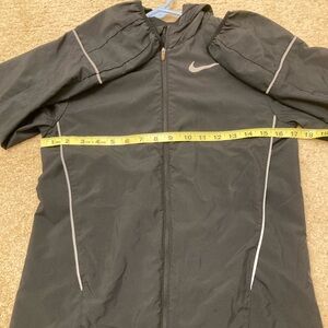 Nike girls black windbreaker jacket. Size large. Reflective stripe on the front and sleeves. Vented in the front and back for comfort. Perfect for school, exercise, or fashion. Great condition with no rips, holes, or stains!