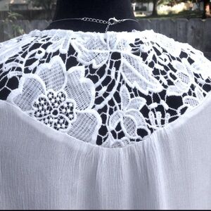 Ivory rayon lace panel sleeveless boho vibe peasant blouse is sure to bring compliments! Cooling, soft and beautiful ivory corded lace peasant blouse with fabric covered button detail. Flowy 90% Rayon, 10% polyamide.