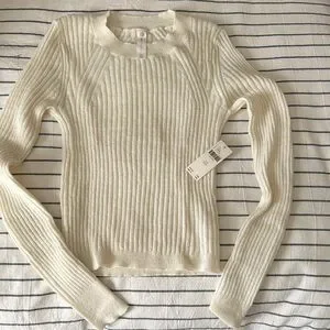 This cream crew neck sweater features a ribbed knit texture that adds a touch of sophistication. With long sleeves and a slim-fit design, it offers a flattering silhouette perfect for layering or wearing on its own. The standard torso length makes it versatile for various outfits.
