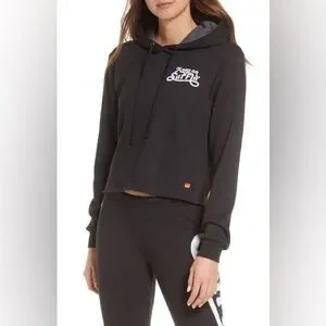 No Hoodie strings, but part of the original tag is still attached as you can see in the last photo! I believe someone just decided not to wear this so it looks great!!