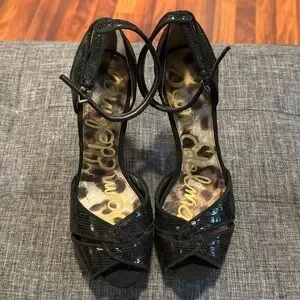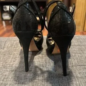 Black Size 7.5 Sexy 4 3/4 inch heel with a 1 1/2 inch platform midsole. Cushioning insole, textile lining. Adjustable ankle strap. No box.